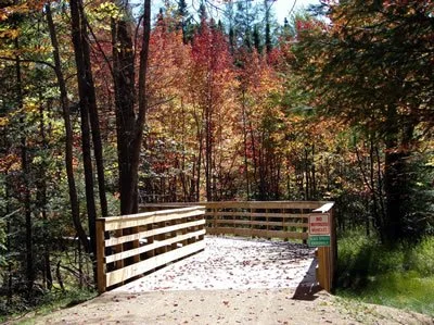 At the 6 mile marker, you will cross under the Wisconsin Public Service power line. And, in less than a half-mile you will reach the Mud Creek Bridge over, you guessed it, Mud Creek. This stream flows from Columbus Lake, about .75 miles to the west. It meanders through mostly wetland areas over several beaver dams, eventually joining the Wisconsin River just west of the City of Eagle River at Watersmeet Lake. The bridge affords a nice view of the Mud Creek floodplain which is home to a good variety of birds and animals. Just north of the bridge is the 6.5-mile marker. Soon after this point the trail leaves the flat, floodplain region and gains some elevation to a gently rolling portion of the Trail.